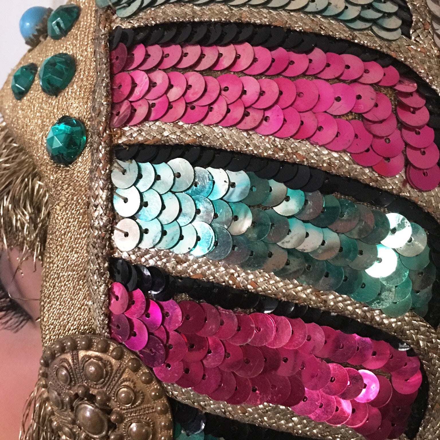 Bridget's Cabinet was able to get its hands to some original stage items from the Parisian theater Folie Bergerès , these items come from the collection of a former director of the famous French Folies Bergeres Theater from Paris. One of these items is this beautiful Egyptian revival stage headdress. It has been stored for decades in a glass showcase so this piece is still in great condition, as mentioned this stunning headdress has been used in a Folie Bergeres show. This amazing find is made from gold lame fabric and sequins with brass ornaments on the sides and a big one on top. beautiful rhinestones complete this stunning piece.