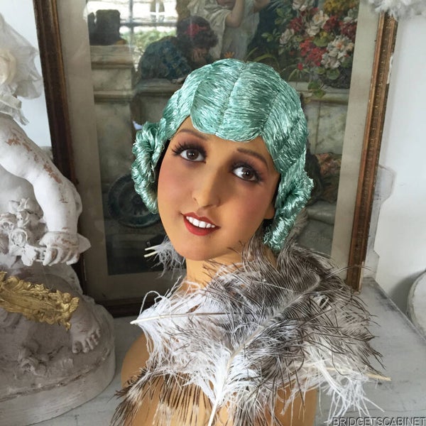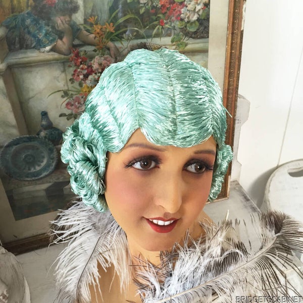 This is another very rare 1920s wig from a unique private collection from France we were able to obtain after many years, there aren't many left in the world today, you can either find them in museums or private collections. they were quite a hit in the Roaring Twenties. they are so rare, if you google these wigs you may find just a few of them in museums or past sales. One of the finest and most elegant wig cloches to be found, the wig is woven from very thin and fine sort of raffia threads into the classic hairdo of the 1920s Flapper period, complete with finger waves all over and pinned-up curls at the back and a mysterious curl on the forehead. What makes this evening wig extravagant is the black color and the 2 little foam ears. Can you imagine who did wear this wig once and what a lovely dress she must have had combined with this wig? A very rare treasure from the roaring Twenties in superb condition and even still wearable. it is woven on a silk/cotton cap. These kinds of wigs were hype during the 1920s, they became very popular and also well-known as a "bad hair day " wig. They came in many different versions but there aren't many left these days. you can find them only in private collections or museums. This wig is also coming from a private collection and is considered a beautiful treasure from the past, a real museum piece. If you have any more questions concerning this item, please don’t hesitate to ask and drop me an email!