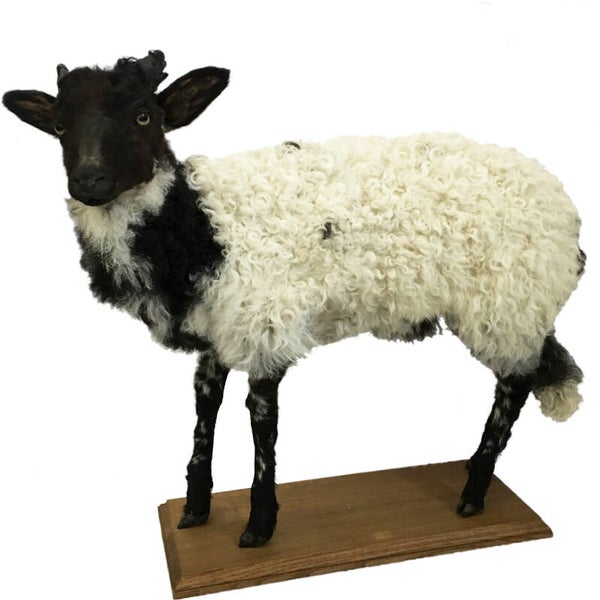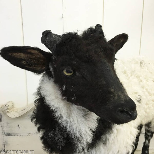 This one I had never seen before, such a beauty, it is from the 1930s, this full mounted Taxidermy sheep a mini sheep you can call it. beautiful black face, black and white curly fur. it is firmly standing on a heavy oak wooden base. the condition is really perfect.