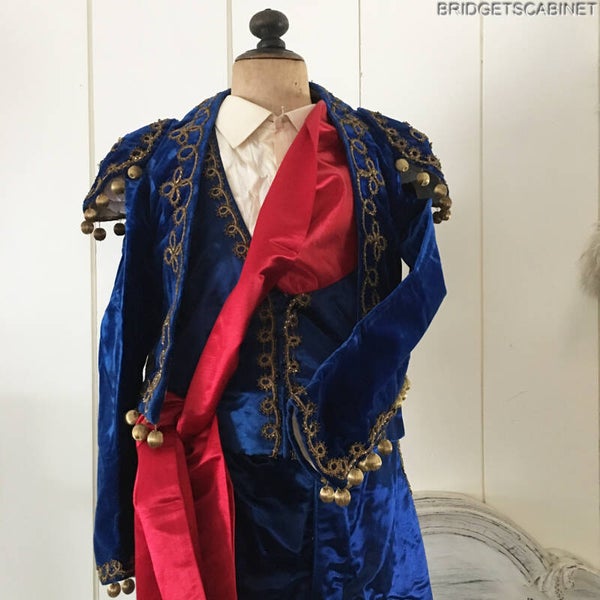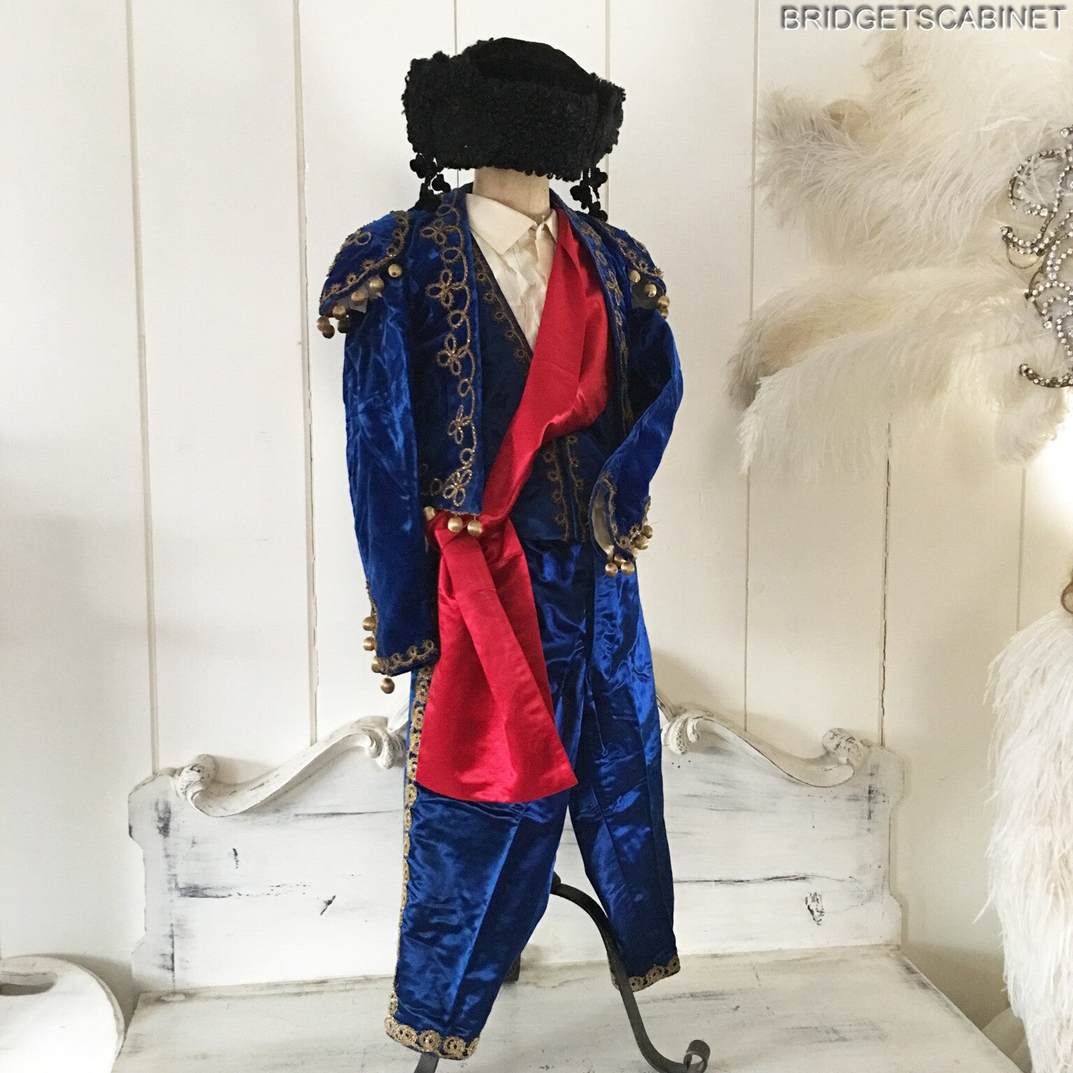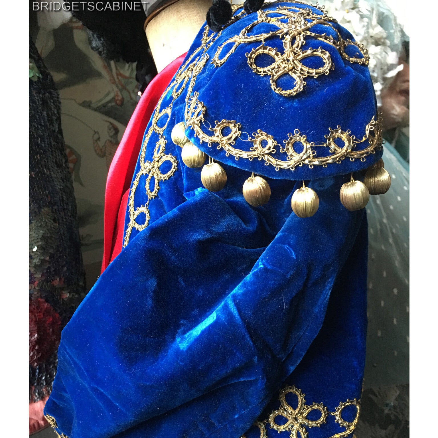 Bridget's Cabinet found this stunning 1920's Child Matador costume made out of a beautiful blue velvet fabric with silk and gold metal threaded embroidery and little gold threaded balls. it is a 4 pieces costume with hat, it is still in its original gift box with original old newspaper used as wrapping material, we unpacked it for the pictures but wrapped it again how it was saved for many many years.