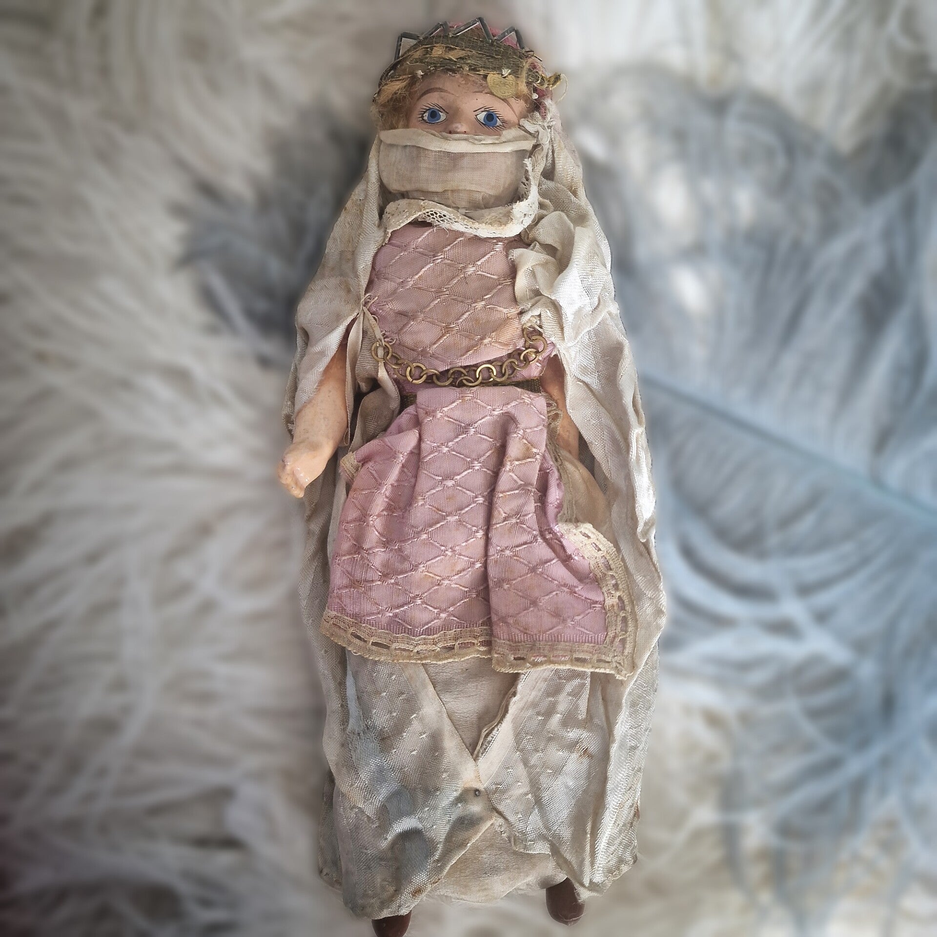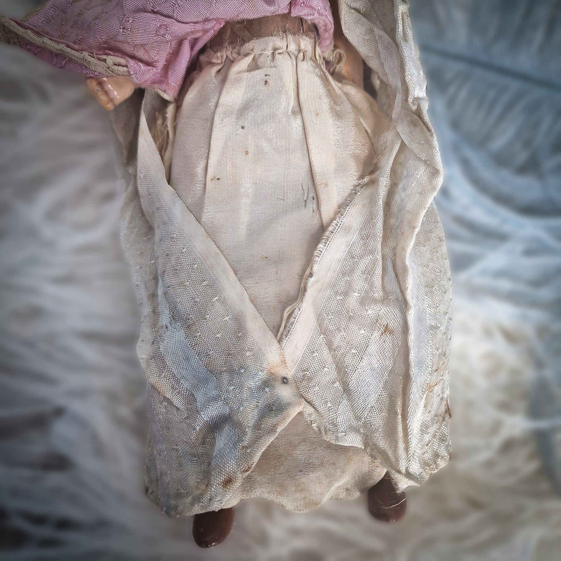 Over the years, both the doll and its clothes have naturally discolored, and there are some defects and repairs that add to its unique charm and character. This lovely piece is a wonderful addition to any collection of antique dolls, jewelry, or boudoir items.