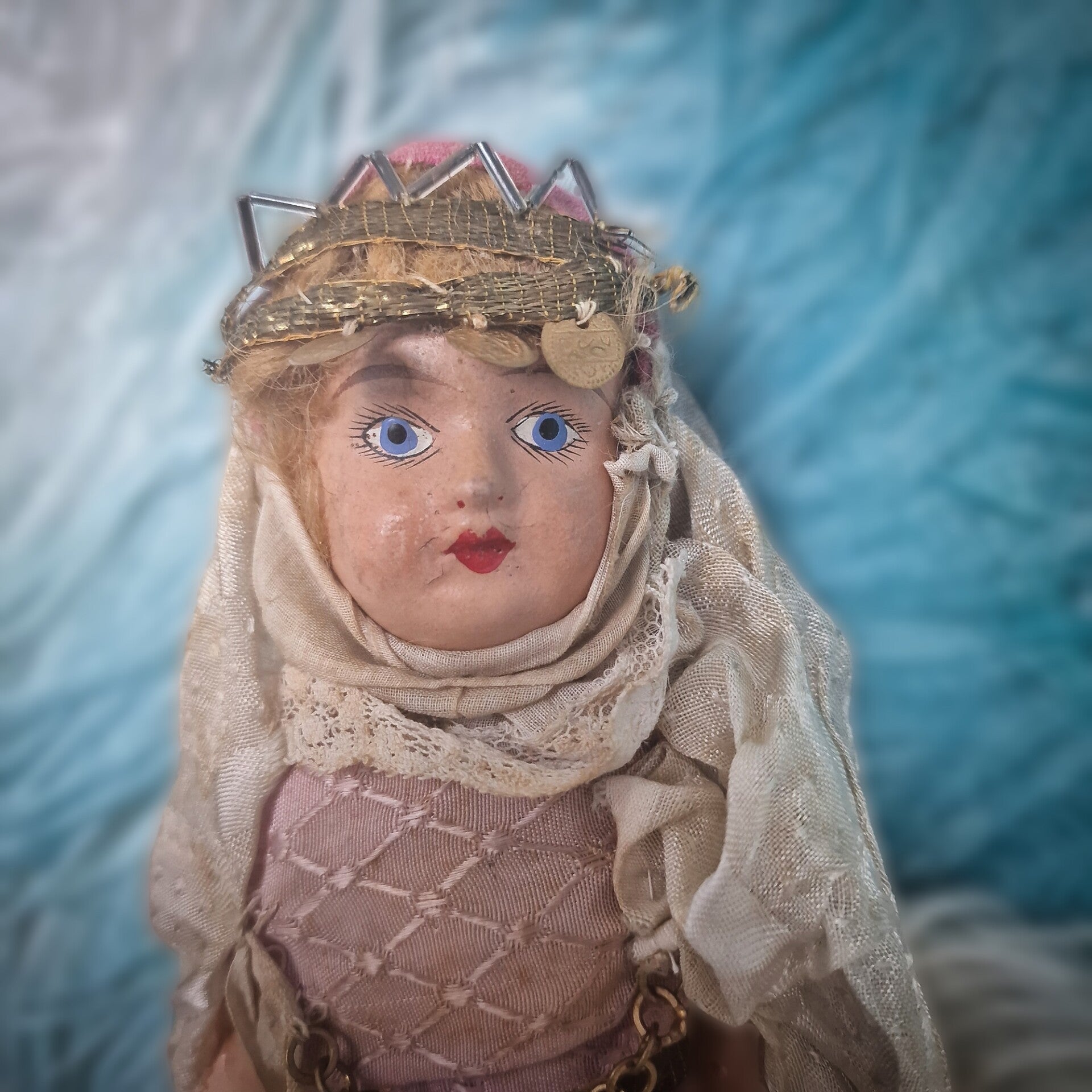 charming antique doll styled as an oriental belly dancer, inspired by Paul Poiret's famous 1002 Nights party and the Egyptian Revival era. Crafted around 1900 in France, this doll is made of composite material with a body filled with paper and straw.