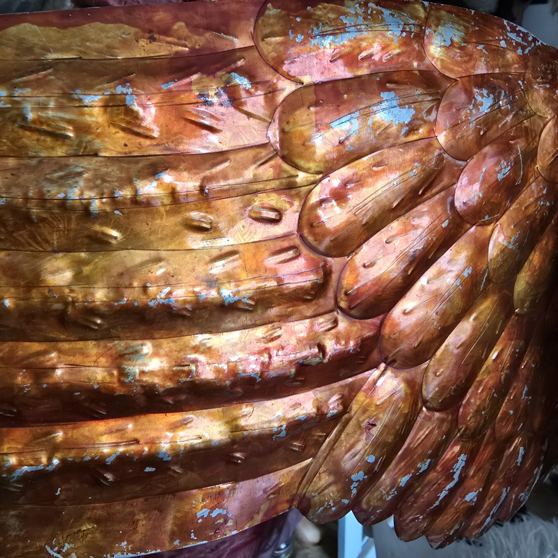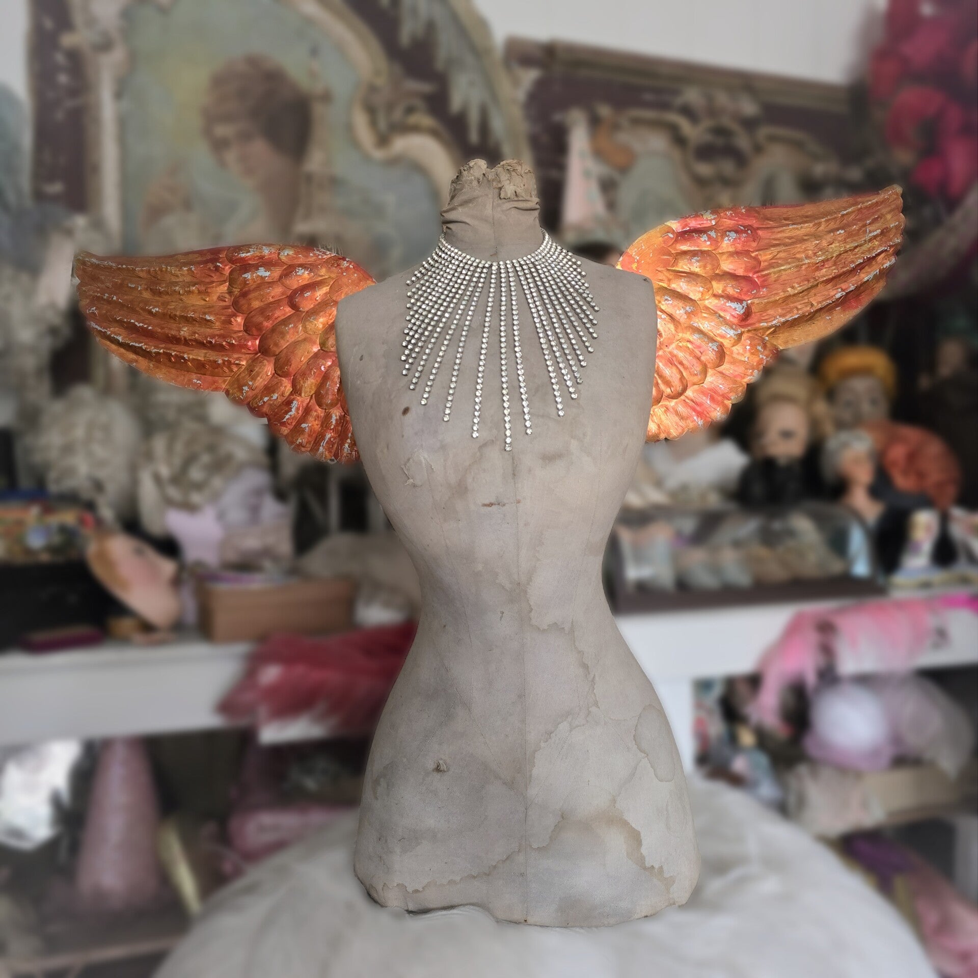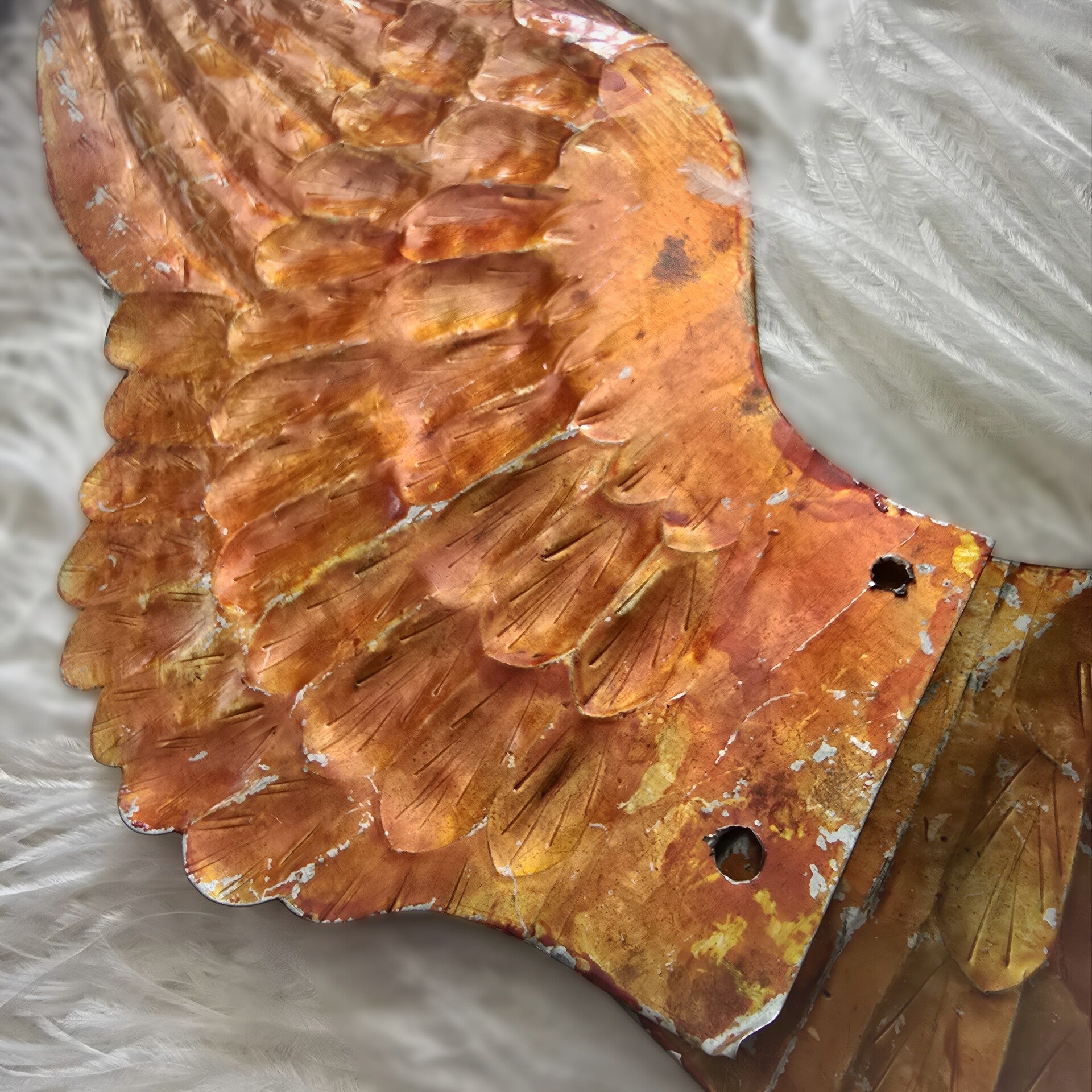 Delicate and beautifully aged, these original antique French wings are crafted from thin, pressed metal with a vibrant red-orange metallic finish. The sculpted feather pattern is richly detailed, giving the wings a subtle three-dimensional quality.