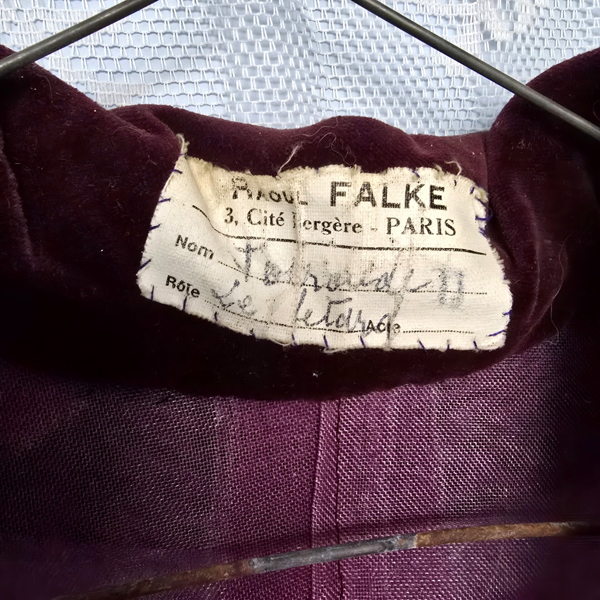 Whether adorning a mannequin or draped over a hanger, this jacket promises to infuse any space with the enchantment of bygone Parisian theaters. Embrace its rich history, complete with original labels and stamps, and add a touch of vintage sophistication to your collection