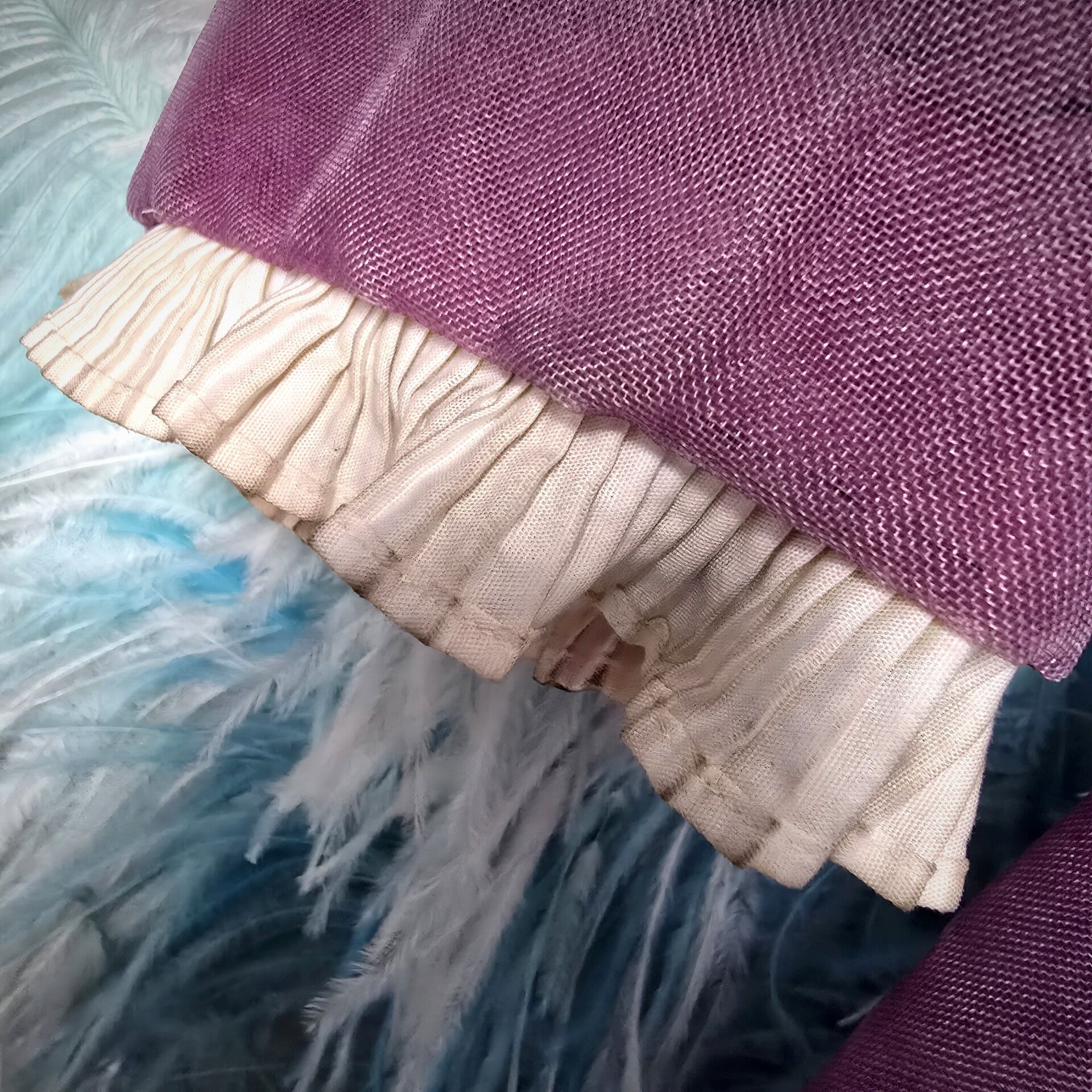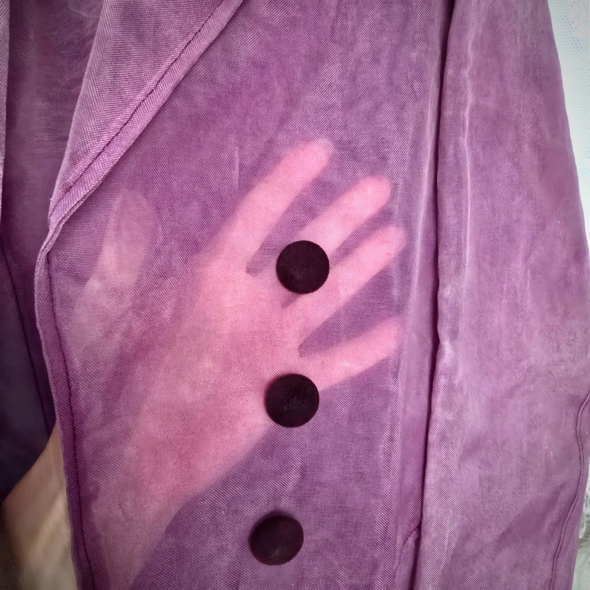 Perfect for a sultry burlesque performance or as a captivating decor piece, this jacket exudes boudoir charm. Its translucent fabric offers a tantalizing glimpse while maintaining an air of mystery. The deep Purple/Pink hue, complemented by the contrasting velvet collar, catches the light with a subtle shimmer reminiscent of stage glamour.